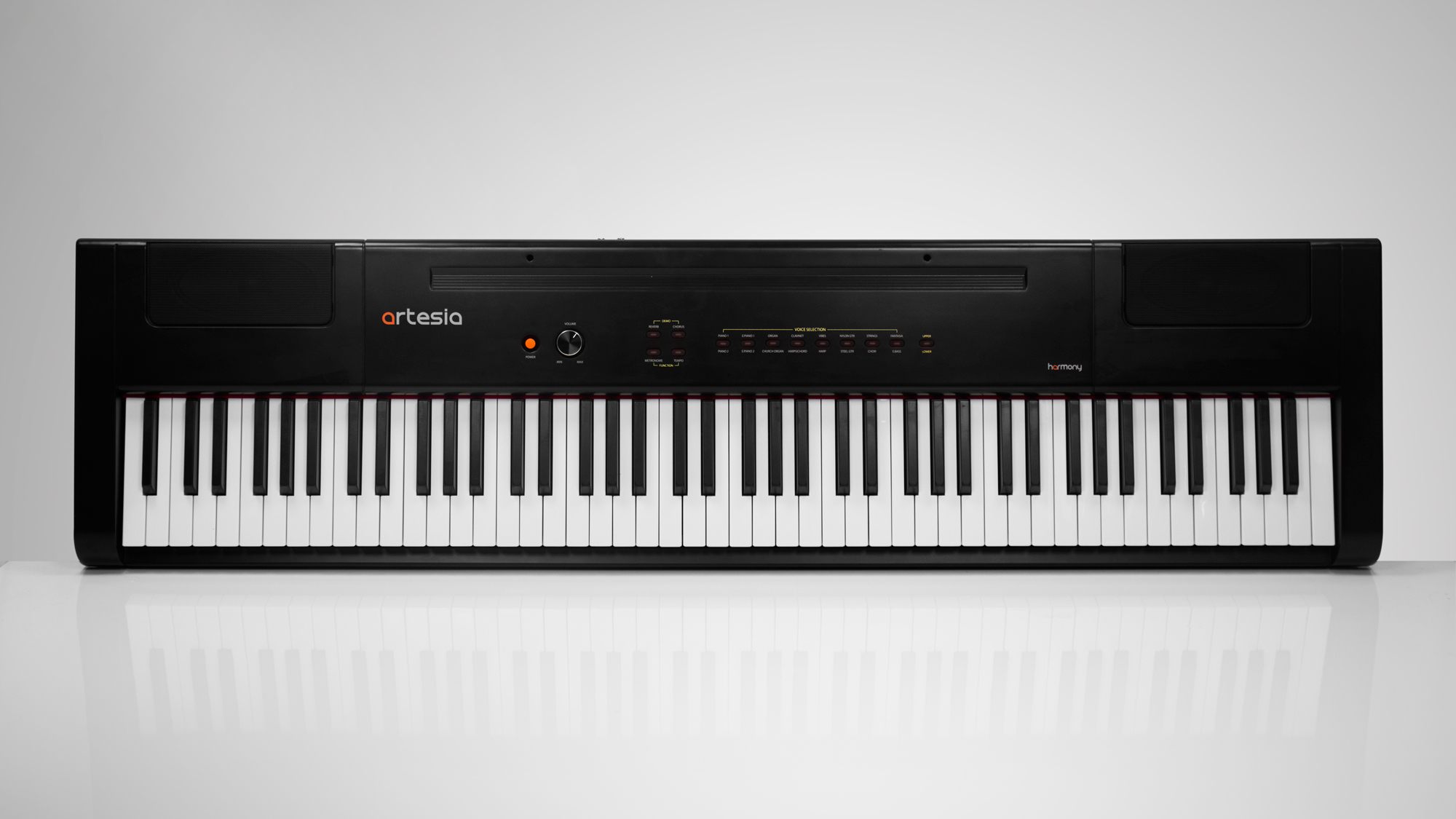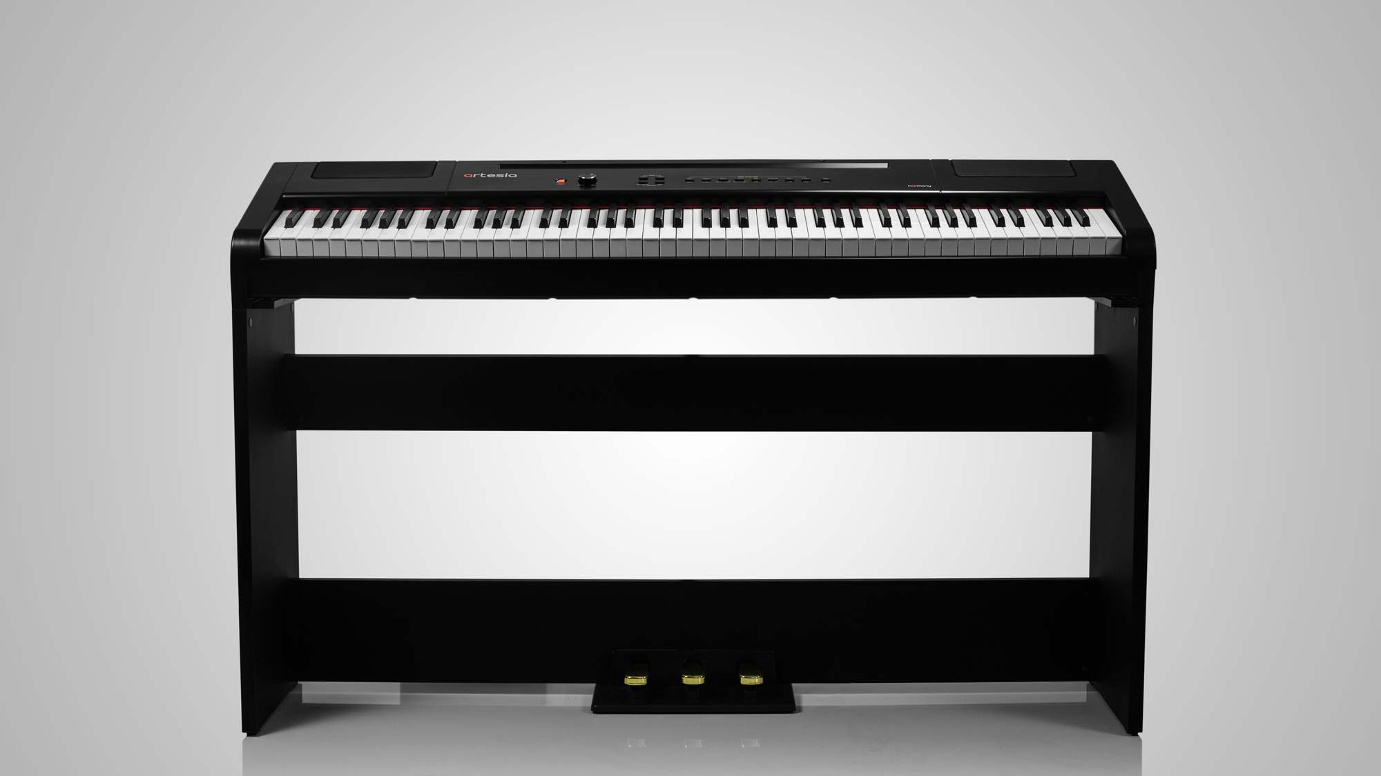 The Artesia Harmony Piano is not only a stylish, traditional furniture piece sure to enhance any room, but it’s also a full-featured, deeply expressive studio piano with a robust sound that you will love to play! The weighted, hammer action keys give you a smooth, natural feel to resemble that of a traditional acoustic piano. The Harmony comes complete with a sleek matching furniture stand with a built-in three pedal system with Soft-, Sostenuto-, and Sustain Pedals. The Harmony also includes the latest in music technology and the USB to Host MIDI Connection port lets you connect your piano to digital recording software, learning apps, and other options to allow for endless musical opportunities!